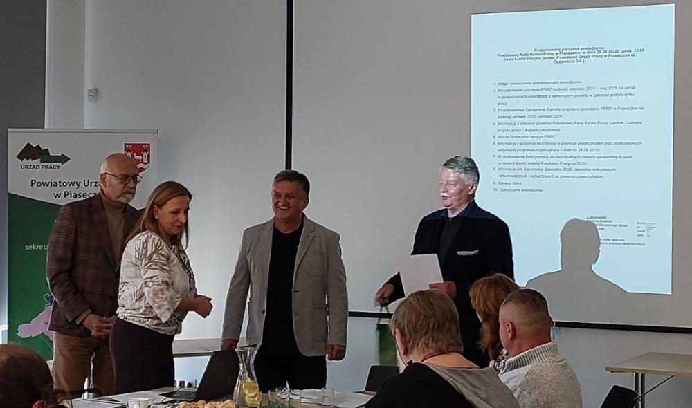 Podczas posiedzenia inauguracyjnego P. Zdzisław Lis - Członek Zarządu Powiatu Piaseczyńskiego, P. Jan Kurzępa - Przewodniczący Rady oraz Dyrektor Powiatowego Urzędu Pracy w Piasecznie P. Krystyna Zwolińska, członkom Rady, której kadencja upłynęła w maju 2025r., złożyli serdeczne podziękowania za owocną współpracę, cenne wskazówki i wsparcie w prowadzeniu lokalnej polityki rynku pracy.