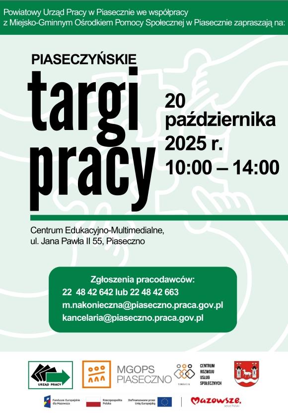 Powiatowy Urząd Pracy w Piasecznie wraz z Miejsko-Gminnym Ośrodkiem Pomocy Społecznej w Piasecznie zapraszają na Targi Pracy, które odbędą się w dniu 20.10.2025 r. w godzinach 10-14, na terenie Centrum Edukacyjno – Multimedialnego w Piasecznie przy ul. Jana Pawła II 55.